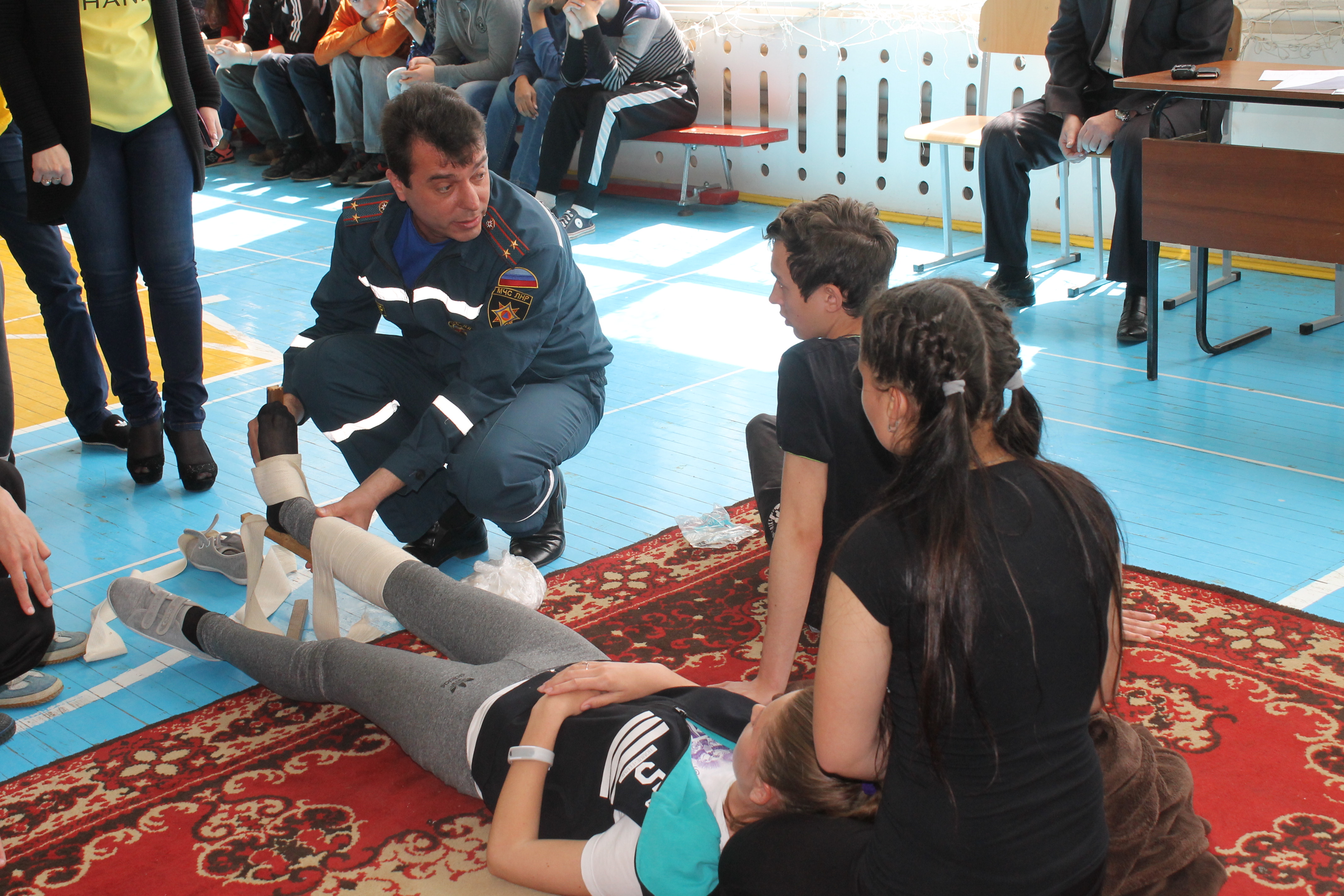 19 мая в спортивном зале Краснодонского промышленно-экономического колледжа прошли соревнования по оказанию первой доврачебной помощи «Юный спасатель». О важности таких соревнований, о необходимости уметь оказывать первую медицинскую помощь говорят следующие данные: по данным Всемирной организации здравоохранения только 20 % из числа погибших во время аварий и катастроф покинули этот мир, получив несовместимые с жизнью повреждения. Сколько же пострадавших осталось бы в живых, окажись на месте происшествия хотя бы один очевидец, владеющий навыками оказания первой медицинской помощи! В идеале, всем людям без исключения хорошо было бы знать, какие действия необходимо предпринимать при несчастном случае. Команды, принявшие участие в соревнованиях, показали замечательные знания и умения в интеллектуальном состязании «Знатоки ОБЖ», конкурсе-тесте «Аптечка», состязании капитанов «Я знаю все!», спортивно-прикладной эстафете, конкурсе по практическому оказанию первой доврачебной помощи «Травмпункт», в котором студенты наглядно демонстрировали навыки по оказанию первой медицинской помощи пострадавшему при различных повреждениях. Готовили команды к соревнованиям преподаватели дисциплин «Основы безопасности жизнедеятельности», «Основы охраны труда», «Охрана труда в отрасли» Роман Петренко, Снежана Зелинская, Владимир Губарев, Ирина Шальнова. В состав жюри, кроме сотрудников колледжа, вошли гости – Владимир Антонов, начальник Краснодонского отряда МЧС, Ирина Ермакова, главный страховой эксперт по охране труда Фонда социального страхования от несчастных случаев на производстве. Гости в ходе соревнований не только оценивали участников, но и делились своими знаниями, давали ценные практические советы, делали замечания по оказанию первой помощи пострадавшим.